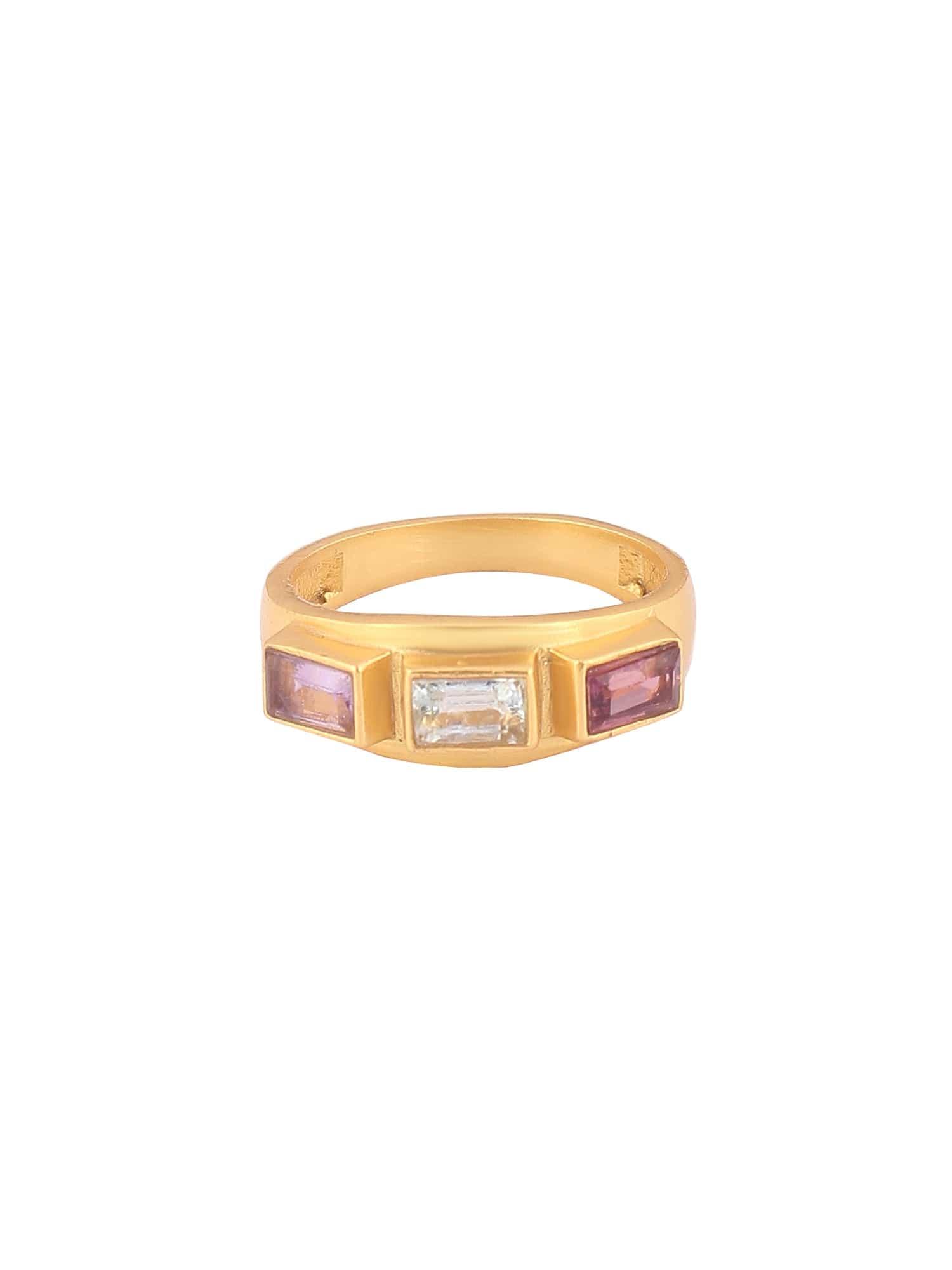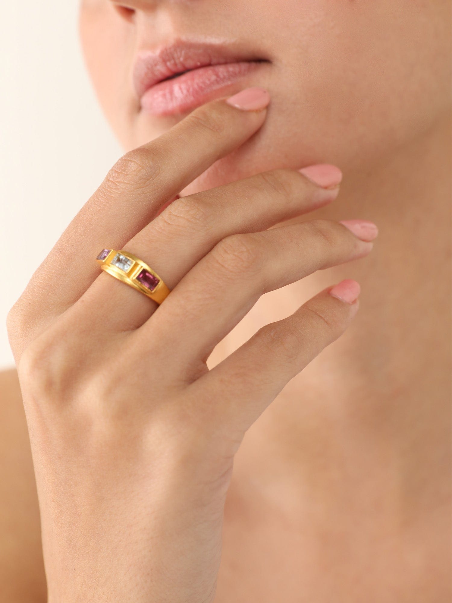 Our Eleonara ring will steal your breath away with how nostalgic it is of the tranquil backdrop of the towns of Cinque Terre, the design including a gilded base with gleaming stones amethysts and tourmaline set upon it.